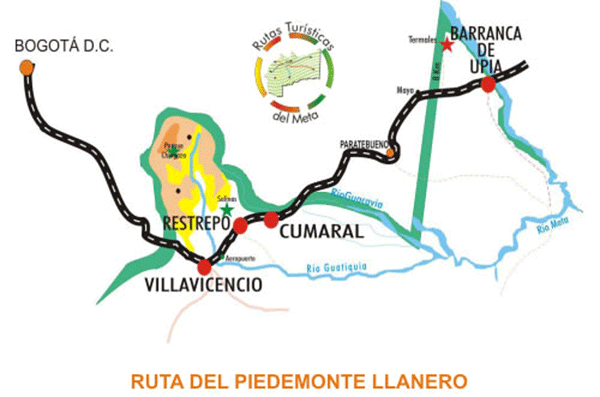 Desde Villavicencio, recorriendo municipios como Restrepo, Cumaral y Barranca de Upia. Atractivos: Glorieta las Arpas, Bioparque los Ocarros, Granja la Cosmopolitana, Seminario de Restrepo, salinas de Upin, Mirador de Restrepo, Reserva Natural de Aguas Calientes (Termales de Guaicaramo), entre otros.
